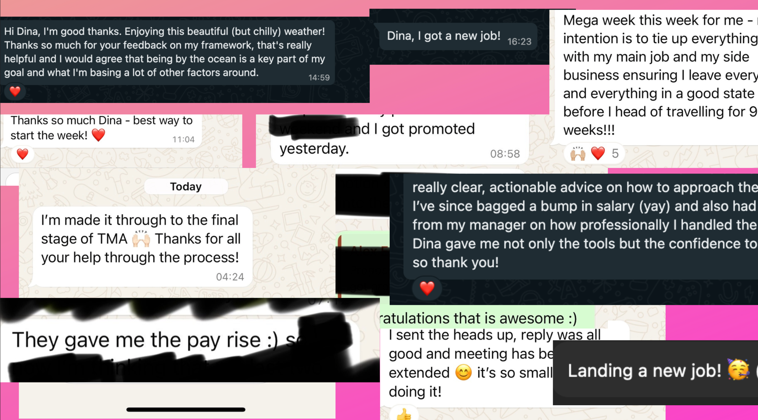 “Dina supported me to shape my dream proposal, which ultimately allowed me to unlock a 3 month sabbatical to travel the world, and subsequently come back to a promotion into a senior management role.”